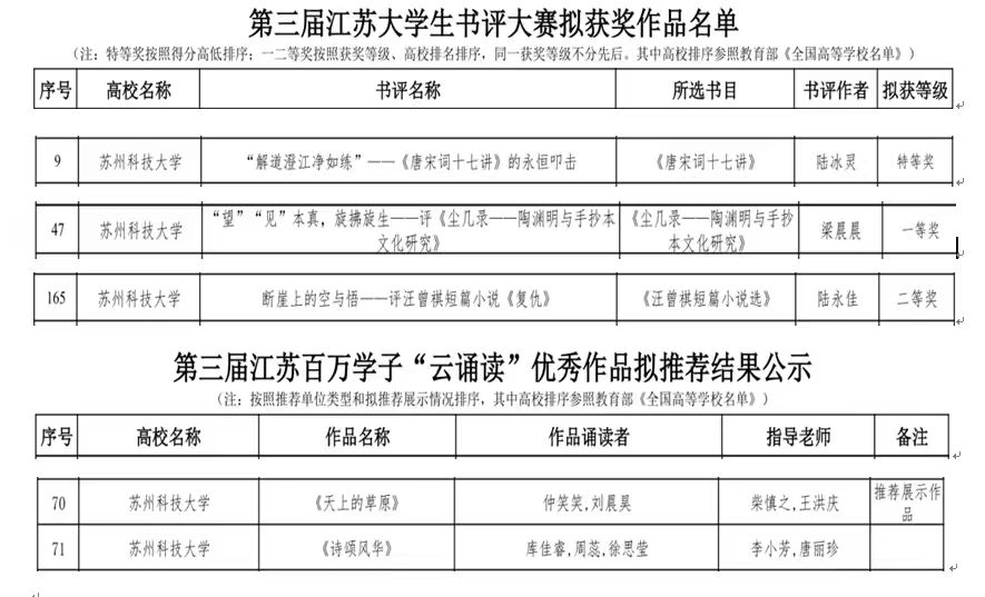 的3个作品荣获特等奖1项(全省仅12项)、一等奖1项、二等奖1项;推荐2个作品参加百万学子云诵读活动,全都获评优秀作品(获奖作品不分等次),其中《天上的草原》入选“推荐展示作品”(全省推荐展示作品40件),将在江苏大学生经典诵读“云展厅”公开展示和宣传推广。