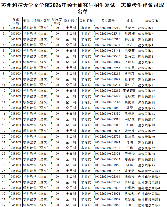 大老爷娱乐城(简体版)官方网站 2026年硕士研究生招生复试一志愿考生建议录取名单